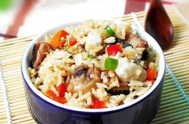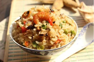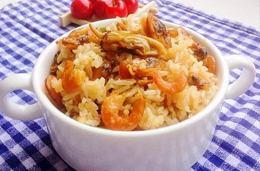 3.于作法2的锅中加入洗净的意大利米继续以中火翻炒,再以以一杯一杯的方式加入鱼高汤,一边加入鱼高汤,一边必须继续翻动锅中所有的食材。