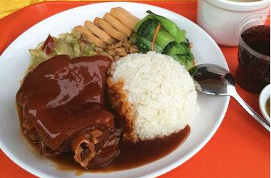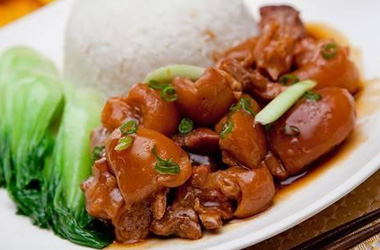 隆江猪脚饭是用猪脚、饭制作的一道主食。猪脚中含有丰富的胶原蛋白,这是一种由生物大分子组成的胶类物质,是构成肌腱、韧带及结缔组织中主要的蛋白质成分,具有美容养颜的作用。